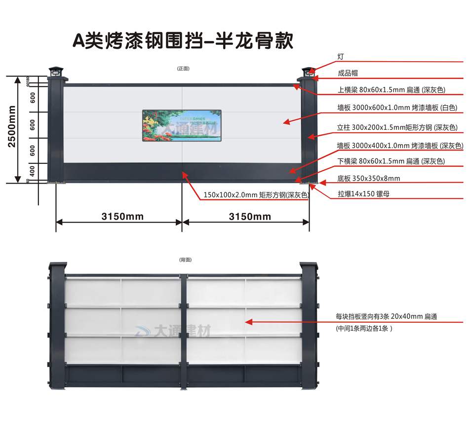 深圳市大通建材有限公司A類(lèi)烤漆鋼圍擋-半龍骨款廠(chǎng)家直銷(xiāo),美觀大氣、穩(wěn)固耐用;適用于深圳圍擋市政建設(shè)施工、房地產(chǎn)項(xiàng)目施工、地鐵項(xiàng)目施工、管網(wǎng)改造等工程,為很多項(xiàng)目施工工程提供圍擋批發(fā)、圍擋安裝及圍擋廣告業(yè)務(wù)。