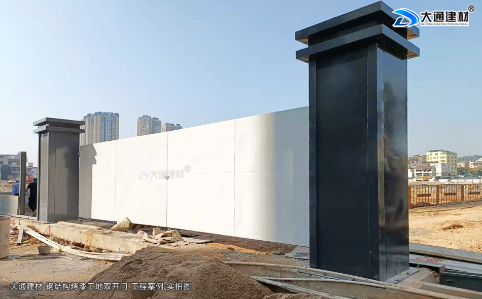 這個建筑工地大門采用的是深圳大通建材生產的項目施工現場的鋼結構烤漆工地雙開門,白色烤漆鋼材制作,雙開門加兩根霸氣大立柱,整個大門看起來很有氣勢
