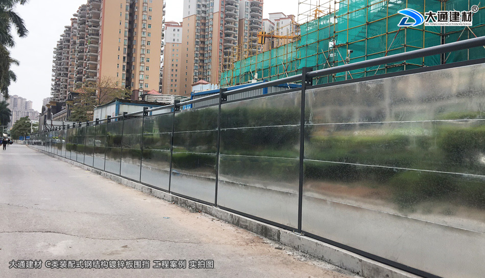 東莞建設(shè)工程項(xiàng)目選用深圳市大通建材有限公司生產(chǎn)批發(fā)的鋼結(jié)構(gòu)圍擋C類,裝配式圍擋安裝方便,鍍鋅鋼板2.4米高符合工地施工圍擋要求標(biāo)準(zhǔn)