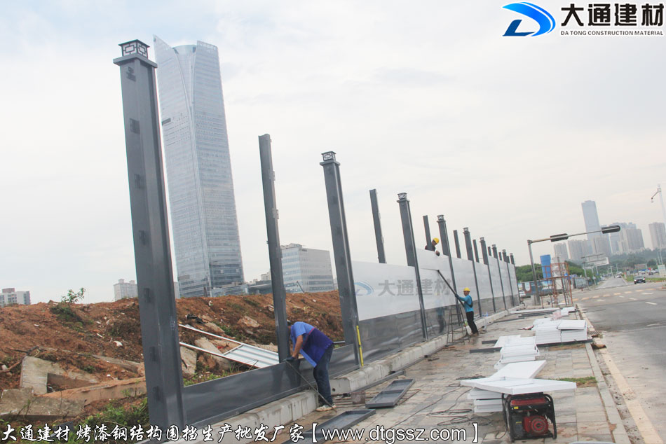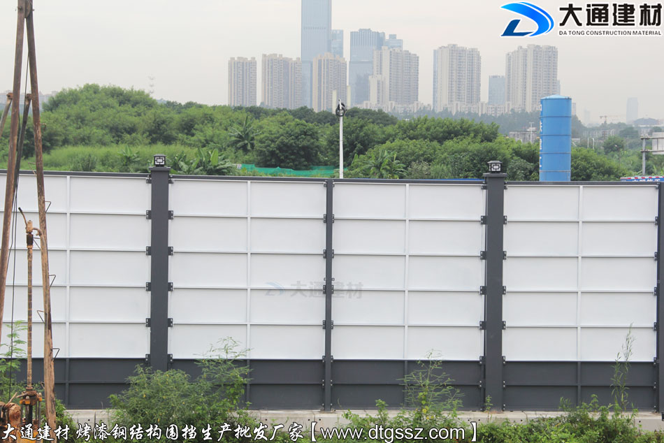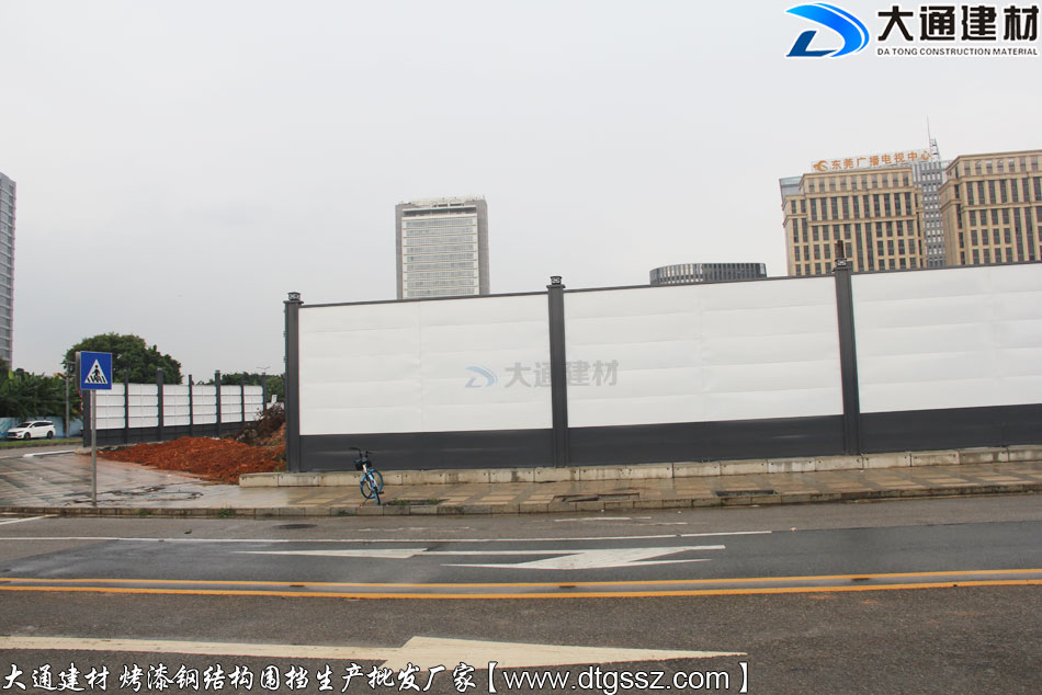 東莞廣播電視中心附近施工工程項目使用大通建材根據用戶的需求定制化生產的4米高的鋼結構圍擋,這款圍擋是大通建材推出的性價比很高的A類烤漆圍擋半龍骨款,不僅具有美觀環保的特點,還拆裝方便、安全穩固、經久耐用,適合地產工程項目、市政建設施工、道路改造等工程使用。