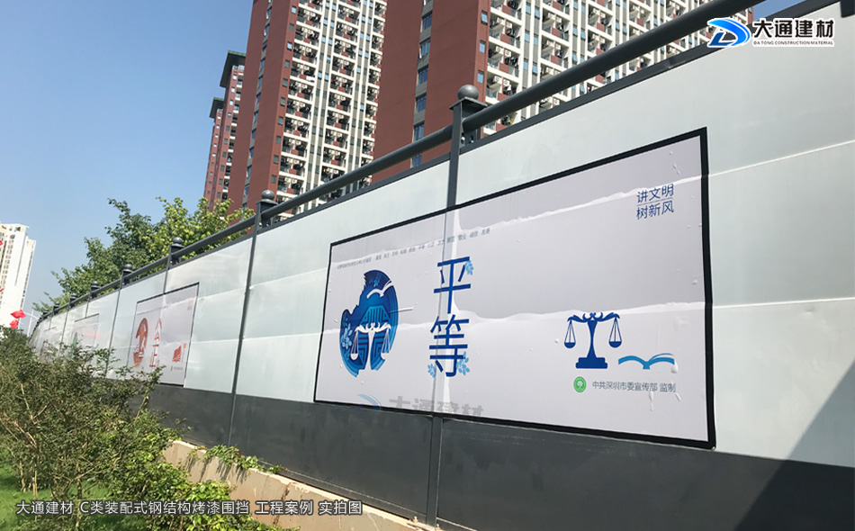 深圳市大通建材有限公司專業(yè)生產(chǎn)烤漆鋼圍擋源頭廠家,大通烤漆鋼圍擋C款符合深圳市標(biāo)準(zhǔn)是一款新型裝配式圍擋,拆裝方便、美觀大氣、綠色環(huán)保、安全穩(wěn)固,在施工時(shí)可以起到了一定的隔離危險(xiǎn),安全防護(hù)作用,已廣泛應(yīng)于深圳各區(qū)域的工程施工項(xiàng)目。