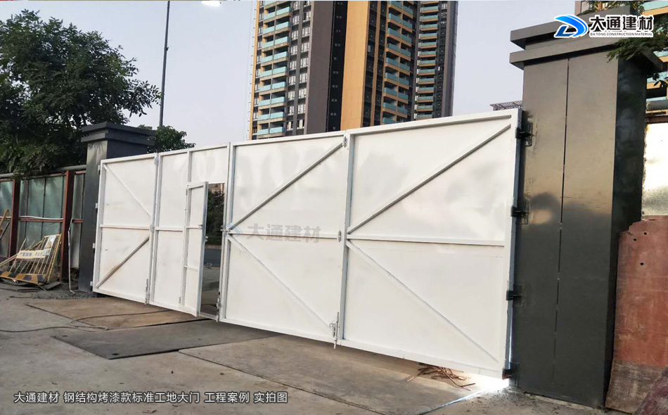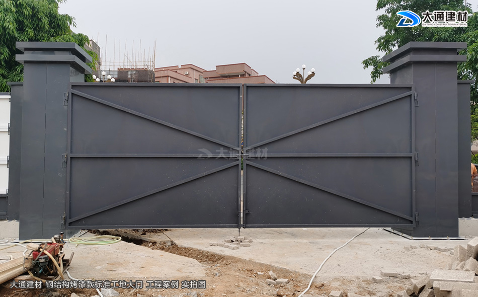 施工安全方案解決工程師,24小時在線等候您的咨詢!我們知道現在市政要求基本上每一個項目施工工地現場都需要安裝圍擋護欄后,方可施工,而施工現場工地大門基本是伴隨著施工圍擋存在的。今天大通小編與大家看看大通鋼結構烤漆款標準工地大門有哪些款式。