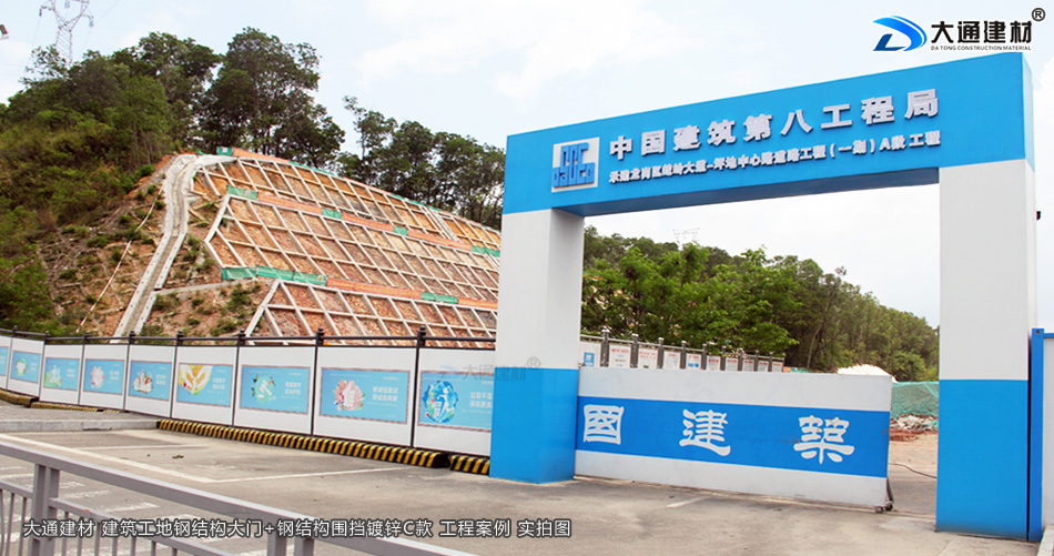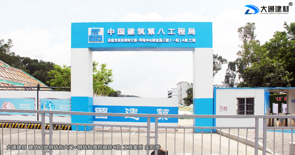 中國建筑八局集團在深圳市龍崗區(qū)蛇嶺大道坪地中心路道路工程(一期)A段的工程項目,選用了深圳市大通建材生產(chǎn)的鋼結構工地大門為項目部大門。