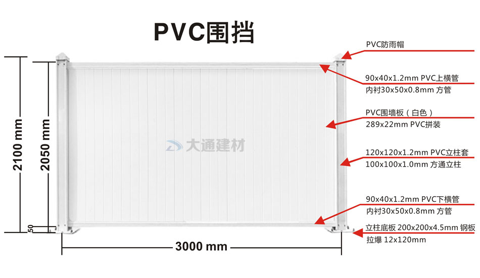 大通建材市政標準PVC圍擋2米高白色款材料規格參數介紹: