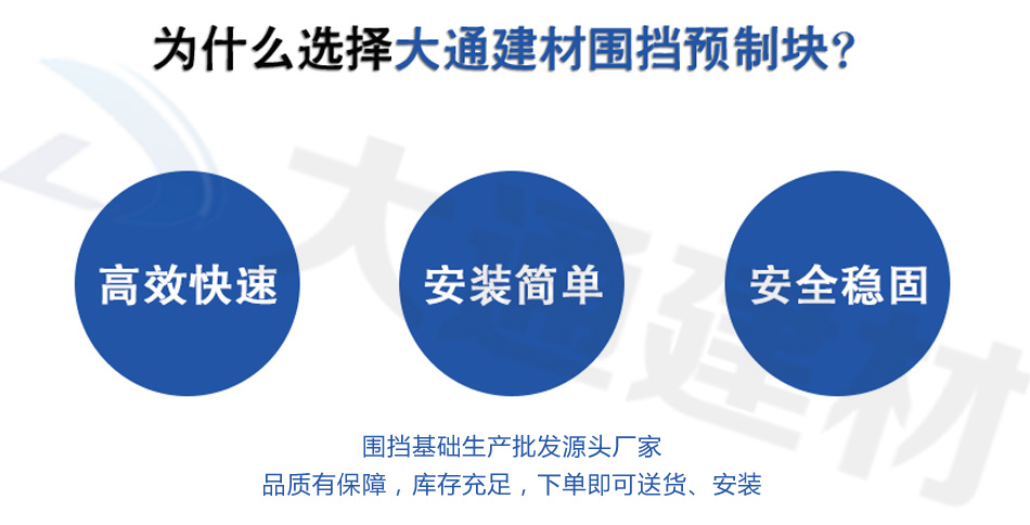 然后我們再來看看塊狀圍擋基礎預制塊的優(yōu)點是不僅抗傾覆穩(wěn)定性好,不易發(fā)生傾覆,強度高,剛度大,安全穩(wěn)固,且常規(guī)尺寸的塊狀圍擋基礎預制塊有現(xiàn)貨,下單即可以發(fā)貨、同時運輸方便,拆裝方便、還能多次周轉使用,即方便又節(jié)約成本。