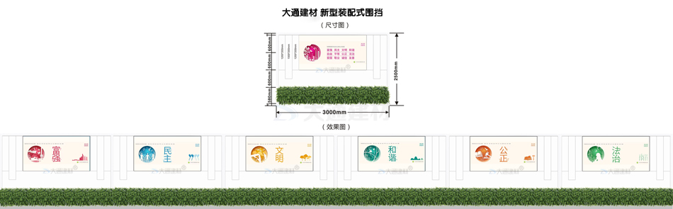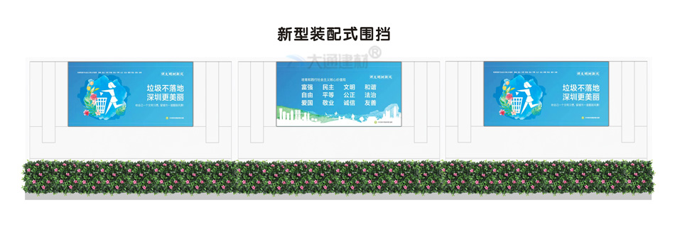 大通新型裝配式圍擋采用全隱藏式立柱、白色烤漆擋板、加上底部配防真綠植,外觀更加美觀、大氣,提高施工現(xiàn)場(chǎng)整體環(huán)境及企業(yè)形象。
