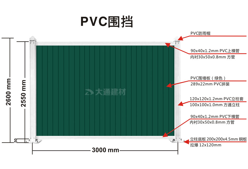 深圳市大通建材推出的這款綠色pvc圍擋的長3米,高2.5米,圍擋墻板是綠色PVC長條版拼接,立柱、橫管均為白色PVC材料,內部均襯塑鋼方通,立柱底板為鋼板,并加斜支撐,增加受力,確保更安全穩固。